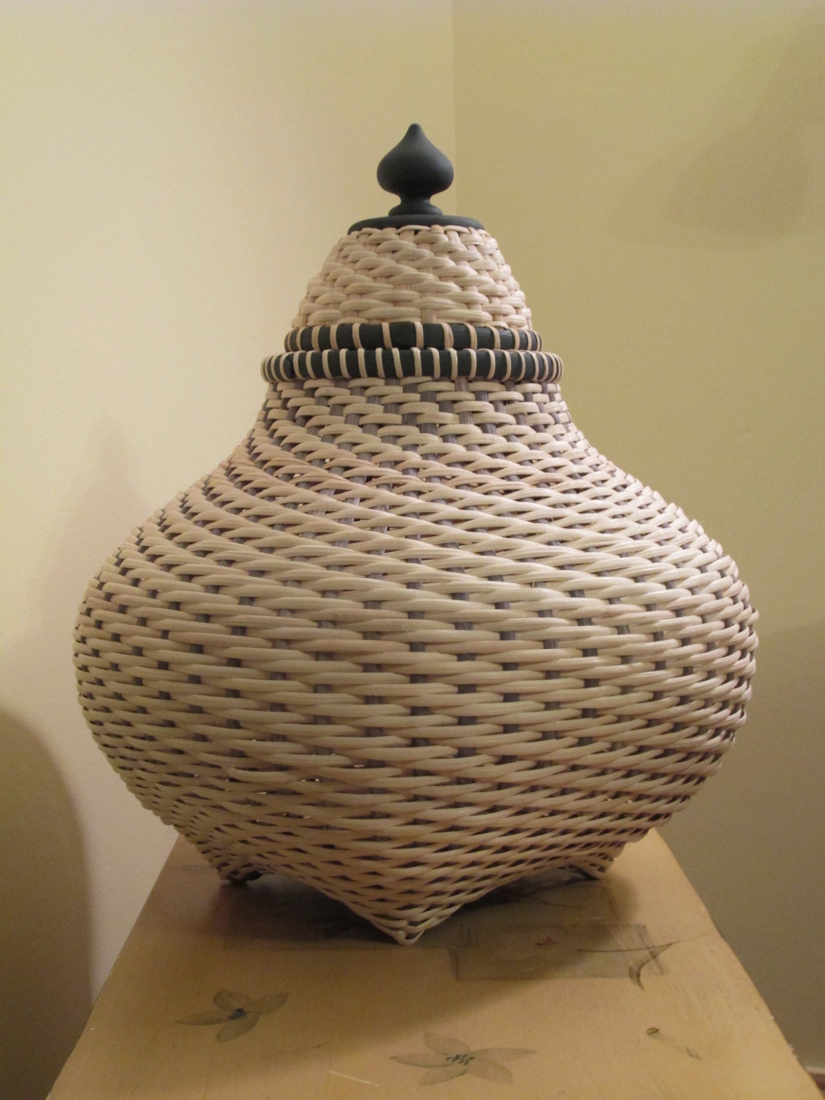 IMG_0386I have finally finished the lid for this basket!  It was touch and go there for a while.  After throwing out the 1st lid, and giving up on the 2nd lid I was determined to make a lid and make it right.  Since I was making it without a pattern or anything else to study I found it to be ‘extreeemly’ difficult.