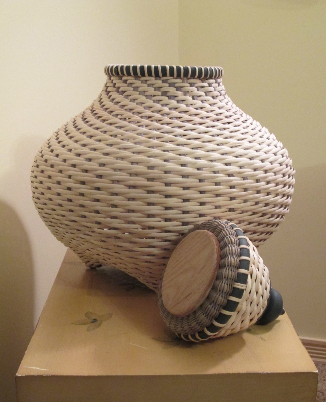 The Bushel basket is 19″ high with a 12″ top diameter. It has multiple colors and is a simple over one/under one weave. We hand dyed all of our reed in this class. The handles are hand carved oak. And, no, I did not carve them myself. Good Grief! I guess you could use this as a laundry basket.