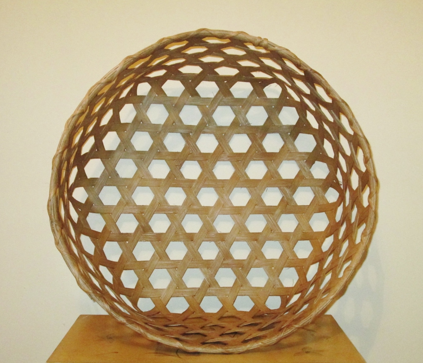 IMG_0521IMG_0522The Shakers used this to age rounds of cheese.  The base is a hexagon with hexagon openings and  as the sides are woven it becomes  round.  Very architectural looking  but extremely confusing to make.  These baskets can be made in many shapes like a triangle or long  oval as in a bread basket.