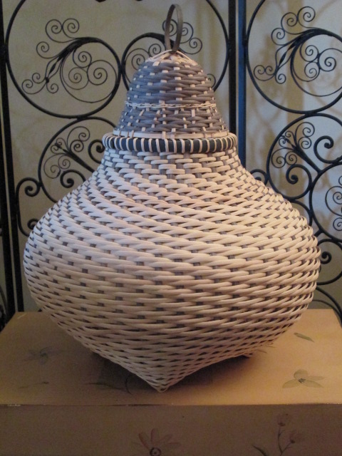 I need to make a lid for a basket by next Saturday. My monthly date with the Tennessee Tri-State Basketry Guild has a “Show and Tell” about lids. Since I’ve never made one, it’s going to be tricky. I’m going to make one for the Large Cathead Basket I just finished. Been working on one (shown here) but it just looks like an upside down basket or a bell sitting atop. Definitely not a lid! And messy looking to boot! No, this one’s a wash. Have another idea. Will keep you posted.
