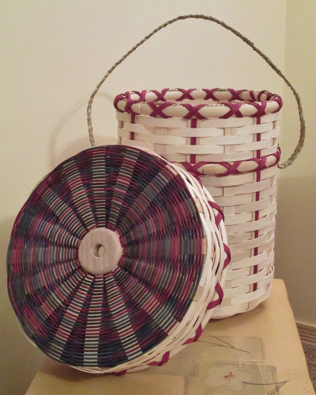 This is a ‘Williamsburg’ basket (named for the handle). I used red and green, naturally, but also some tan and spaced-dyed colors. The handle has a ‘bow’ on both sides and the handle is wrapped in a Japanese knot for some more pizzazz. I think it works.