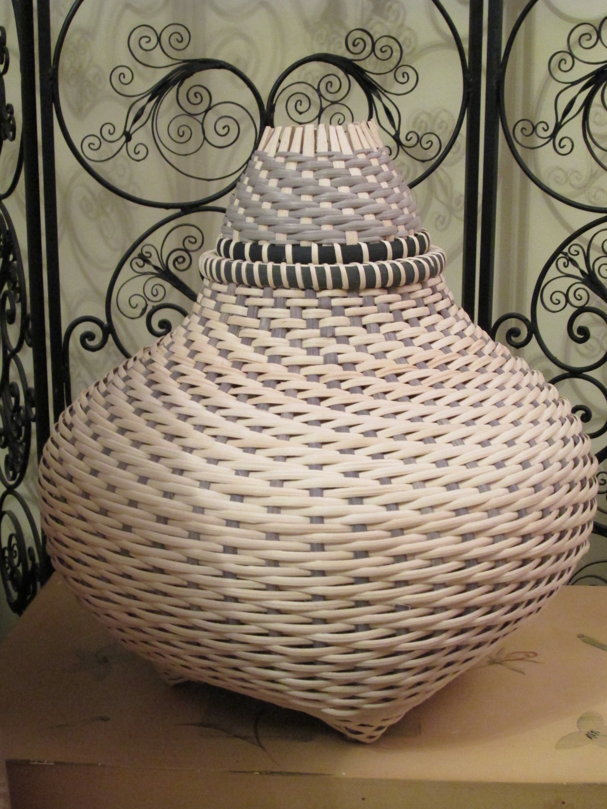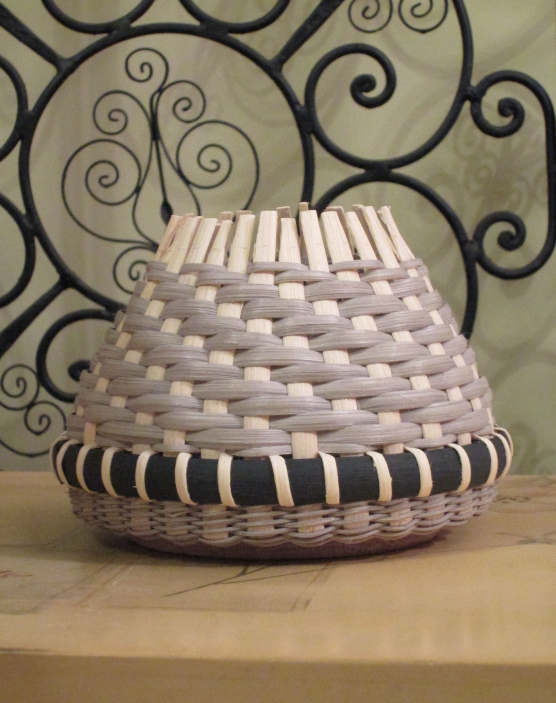Occasionally I like to try unusual weaving materials. This is a 6″ melon rib basket in which I used black cane and galvanized steel from the hardware store.